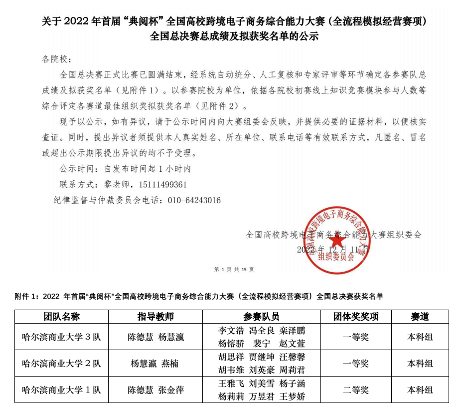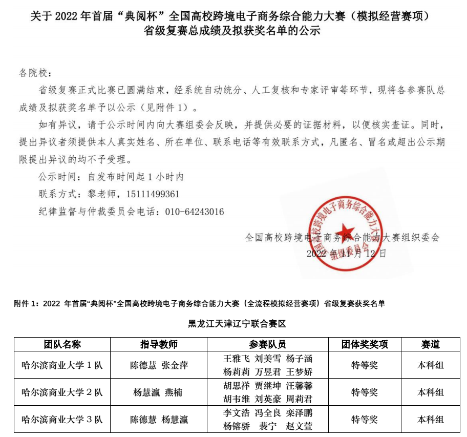 我校经济学院国际经济与贸易专业师生在12月11日结束的2022年首届“典阅杯”全国高校跨境电子商务综合能力大赛(全流程模拟经营赛项)全国总决赛中斩获佳绩。国际经济与贸易专业2020级的18名同学经过层层选拔脱颖而出,组成的三支代表队以包揽省级复赛前三名的优异成绩顺利进入全国总决赛,与全国160多所高校的300多支参赛队伍同台竞赛,经过激烈的比拼,最终喜获团体一等奖2项,二等奖1项,学校获得最佳组织奖,展示出了经济学子奋勇拼搏、勇于实践的精神风貌。
