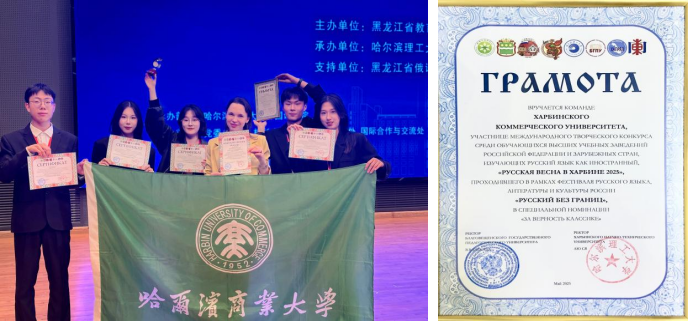 “哈尔滨俄语之春”中俄大学生俄语竞赛是目前国内赛事形式最多元,赛事内容最丰富,赛事范围覆盖最广的俄语类专业比赛。该赛事已纳入“2024-2025中俄文化年”活动。比赛包括俄语朗诵、俄罗斯歌曲、俄罗斯戏剧和俄罗斯舞蹈等。本届比赛共有26所中俄高校、220余名大学生参加比赛。我院2023级国际经济与贸易(对俄经贸方向)1白佳冉、罗心怡和2024级国际经济与贸易(对俄经贸方向)1杨家兴等同学组队参赛,经过激烈角逐,代表队荣获“致敬经典奖”。比赛期间,我校师生参与了“中俄教学研讨会”与“中俄学生论坛”等系列交流活动。