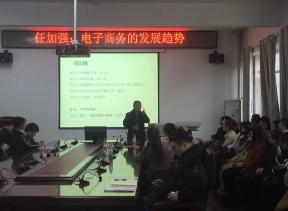 2018年11月13日下午,经济学院会议室座无虚席,现任深哈合作孵化器副总裁任加强先生应经济学院邀请,为经济学院师生做了一场令人受益匪浅的讲座,参加讲座的有经济学院2015级商务经济学和贸易经济专业的学生70余人。经济学院副院长郝大江教授主持讲座。在郝大江教授热情洋溢的欢迎词之后,党委书记蒋孝洪向任加强先生颁发了哈尔滨商业大学经济学院客座教授聘书。随后,任加强先生进行了一场题为《跨境电商的发展趋势》的学术讲座。