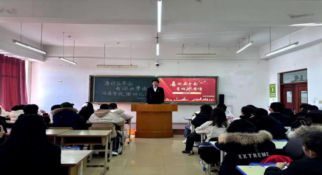 为迎接2025年第九届亚洲冬季运动会的召开,营造关心亚冬、参与亚冬、服务亚冬的浓厚氛围,激励我院学生以饱满热情、昂扬斗志迎接亚冬会,共襄冰雪盛会,绽放青春光彩,11月20日,在A区主楼0304教室,经济学院团委举办“喜迎亚冬会‘青’颂冰雪情”演讲大赛。