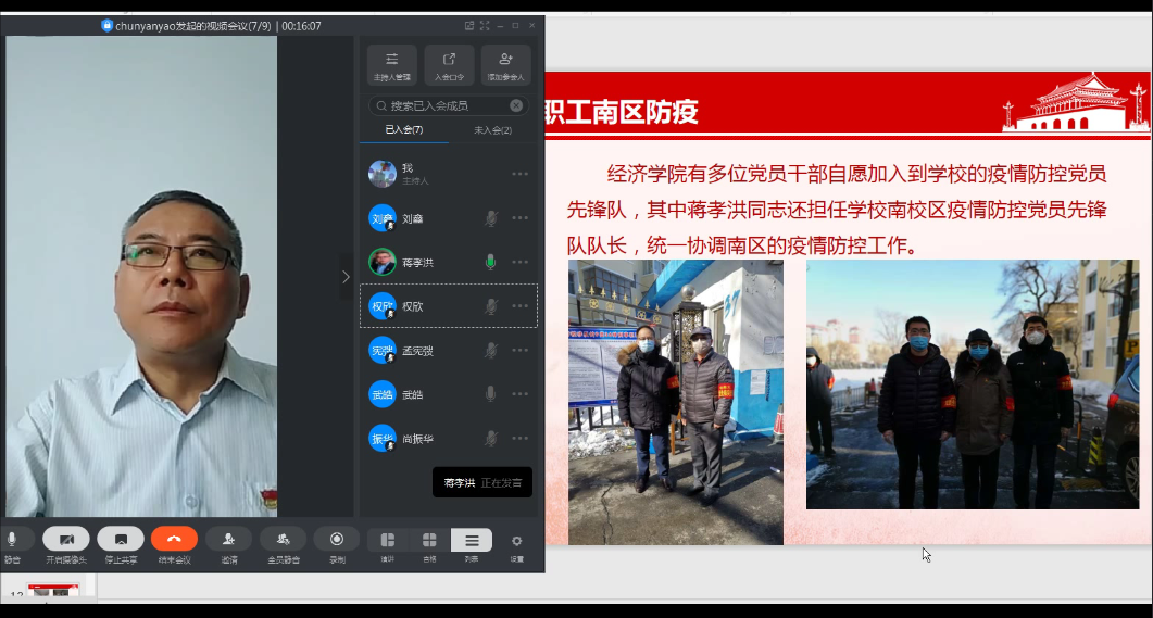 2020年7月3日下午,经济学院党委书记蒋孝洪为经济学院学生工作党支部所有党员同志上了一堂题为“疫情防控”的微党课。支部所有党员参加党课学习,并根据党课内容进行交流讨论,将疫情防控精神和工作要求内化于心,外化于行。