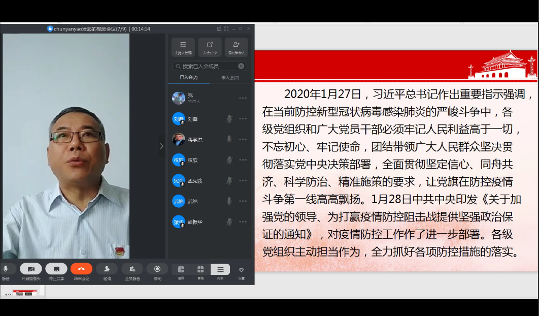 蒋孝洪书记精心准备并讲述了党中央关于疫情防控的指示精神和学校疫情防控工作要求,带领支部党员回顾了经济学院关于疫情防控工作的开展情况和取得的成效。重点阐述了疫情期间“稳就业”等六稳、六保工作内容与要求,并以学院党员教师冲锋一线,为学生打包行李,分装邮寄档案等一系列为学生服务的事迹为例,向支部党员进行了党员职责使命承担、精神品质塑造的生动教育。
