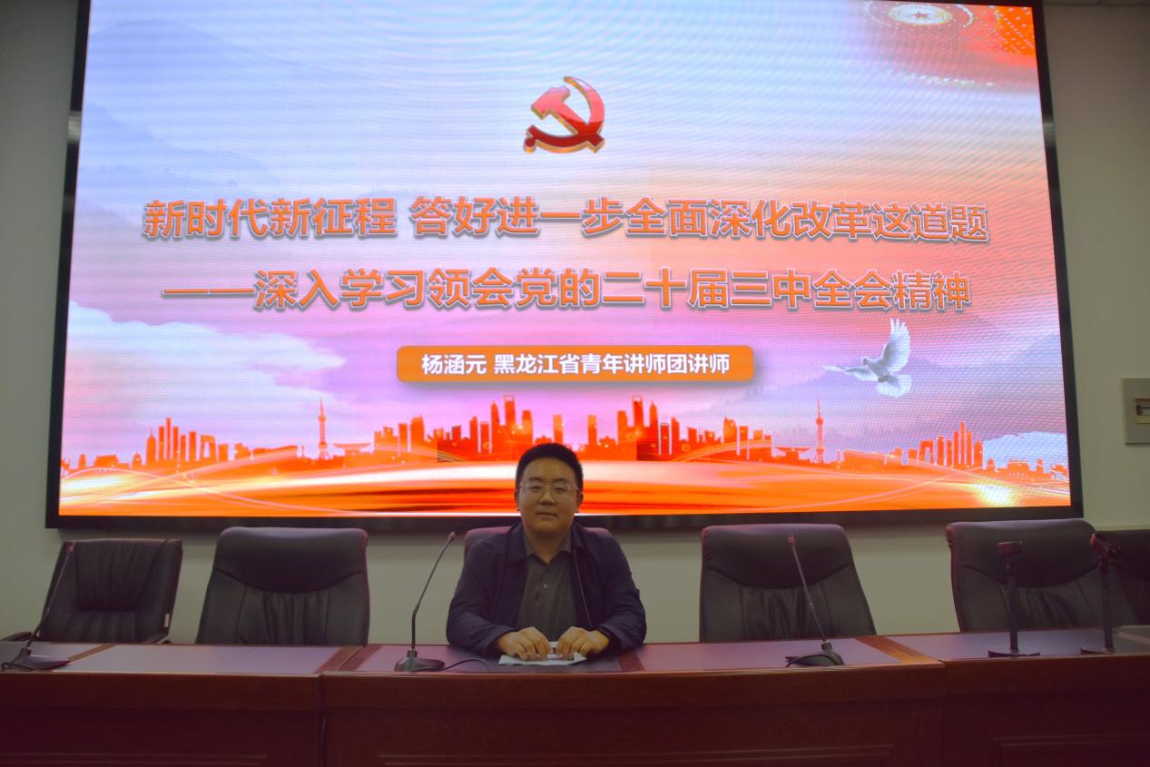 杨涵元以“新时代新征程,答好进一步深化改革这道题”为题,对党的二十届三中全会的主要目标、重大举措和历史意义等进行阐释和解读。并号召大家要认真学习贯彻党的二十届三中全会精神,深刻领悟“两个确立”的决定性意义,增强“四个意识”、坚定“四个自信”、做到“两个维护”,高举改革开放旗帜,凝心聚力、奋发进取,为全面建成社会主义现代化强国、实现第二个百年奋斗目标,以中国式现代化全面推进中华民族伟大复兴而努力奋斗。