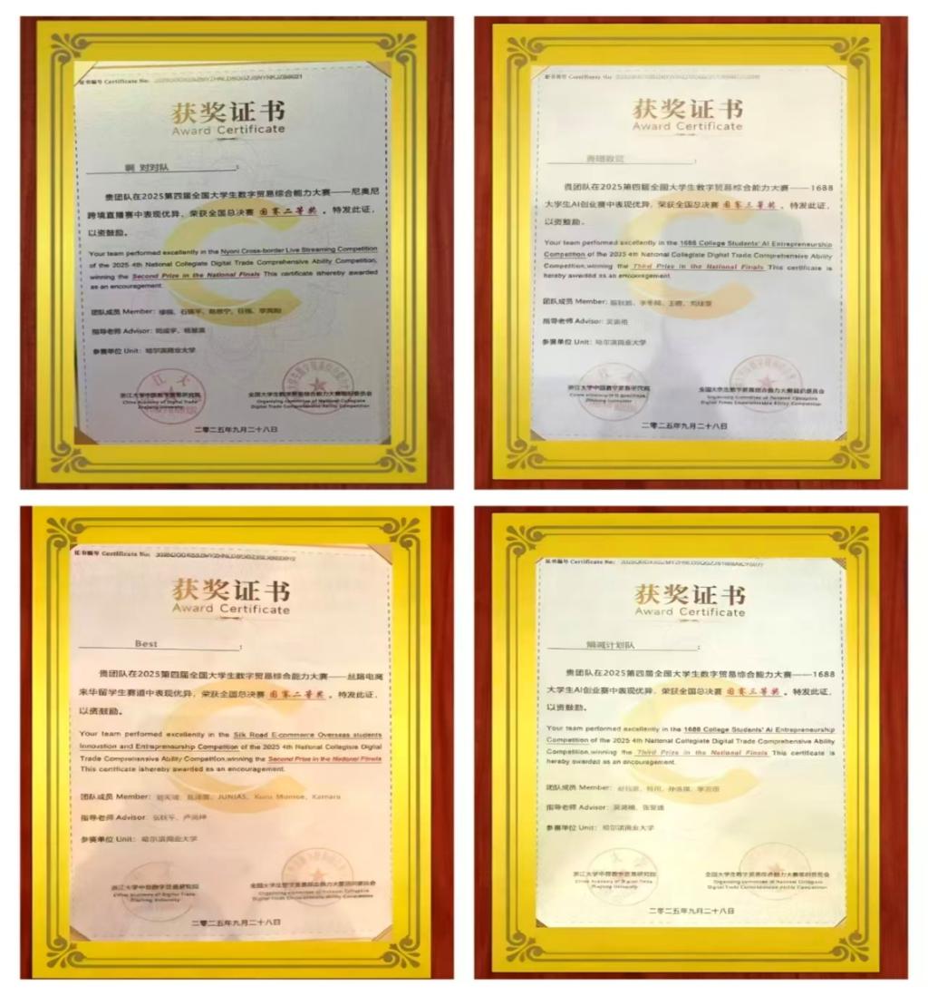 本届大赛规模盛大,高手云集,吸引了来自全国98所高校的上千名选手参与。赛事层层筛选,竞争异常激烈。在“尼奥尼跨境直播赛道”中,由杨慧瀛、司成宇老师指导,穆桐、石锦平、赵思宁、任格、李昊阳同学组成的“啊 对对队”,凭借敏锐的市场洞察与娴熟的专业技能,荣获国家二等奖;在“东方杯丝路电商留学生赛道”上,由张秋平、卢尚坤老师指导,刘天琦、赵泽寰、JUNIAS. Kuru_Momoe.、Kamara同学组成的“Best队”,以跨文化协作能力与创新思维,喜获全国二等奖;在“1688大学生AI创业赛道”中,由吴英艳、张春建老师指导,孙浩翼、秦佳豪、林川、李若语同学组成的“熵减计划队”,以及由吴英艳老师指导,陈秋如、李冬梅、王萌、刘佳雯同学组成的“青珵数贸队”两支队伍均展现扎实的专业素养与创新实践能力,双双荣获国家三等奖!