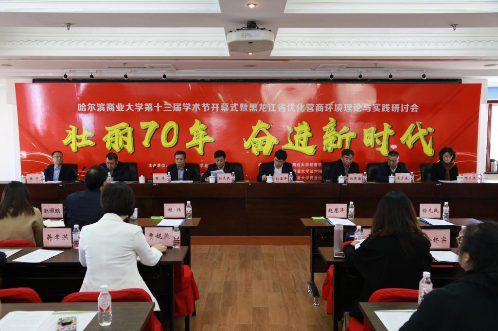 10月11日上午,由我院承办的第十三届学术节开幕式暨黑龙江省优化营商环境理论与实践研讨会圆满召开。黑龙江省营商环境建设监督局党组成员、副局长赵恩泽,黑龙江省社科联学会工作部副部长黄琦,黑龙江省营商环境建设监督局考核评价指导处处长李新峰,黑龙江省商业经济协会执行会长、秘书长李彦春研究员,我校党委书记孙先民,中央红集团创始人、董事长栾芳,黑龙江省法治研究所副研究员吴狄,哈尔滨市政协经济委员会副主任朱智研究员,黑龙江省招商引资研究会副会长、哈尔滨亚麻集团原董事长王玉铁出席会议,学校相关职能部门负责人、各学院领导、教师代表及研究生代表参加会议。副校长程伟主持会议。