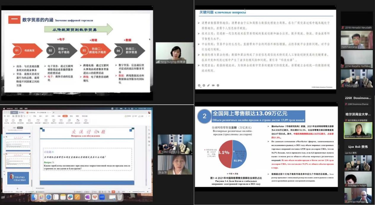 此次研修班通过课堂授课、云参观、座谈交流等方式,全方位、多角度地展示了中国电子商务以及跨境电商的现状和有益经验,为未来的合作交流搭建了良好的合作平台,同时也为进一步加深中国与俄语国家之间的友谊、搭建双方合作共赢桥梁打下坚实的基础。此次研修班由我院负责课程安排和教学管理,我院杨慧瀛副院长、张金萍教授、韩朝亮副教授、陈德慧副教授、张秋平副教授等教师承担了本次研修班的教学任务,钱佰慧和赫刘洋老师负责教学管理。