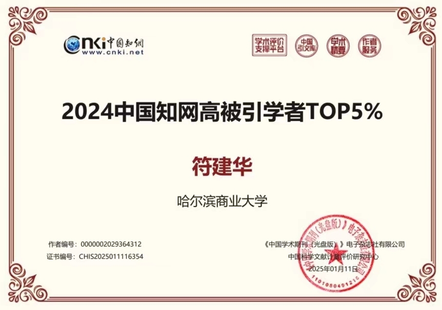 近日,中国知网公布了“2024中国知网高被引学者预发布名单”,哈尔滨商业大学经济学院4位学者入选。其中,杨守德入选应用经济学中国知网高被引学者TOP1%;符建华、杨慧瀛、潘鹤思三位教师入选应用经济学中国知网高被引学者TOP5%。