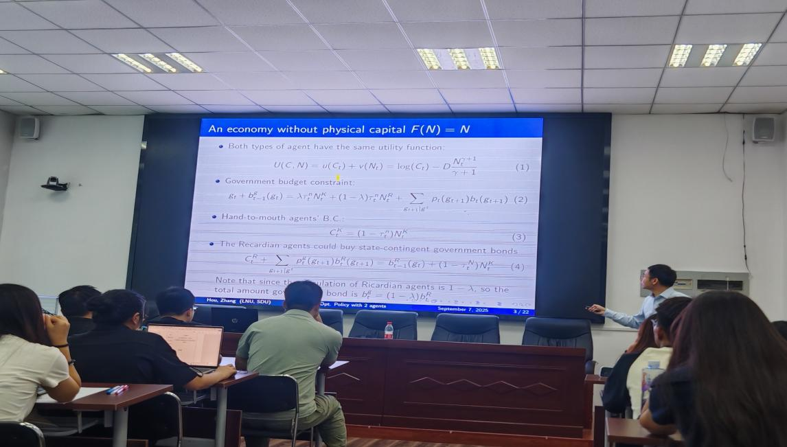 9月8日下午,经济学院在1102会议室举办了“青年学者工作坊”专题讲座。本次讲座邀请了辽宁大学中国经济研究院助理教授侯尚迪博士担任主讲嘉宾,经济学院韩朝亮教授主持讲座。侯尚迪教授以“异质性模型中的最优财政政策”为主题,深入探究了当部分家庭无法持有金融资产(如储蓄、债券等)时,政府如何运用税收和政府债务工具来熨平经济周期,从而最大化全体社会成员的福利。